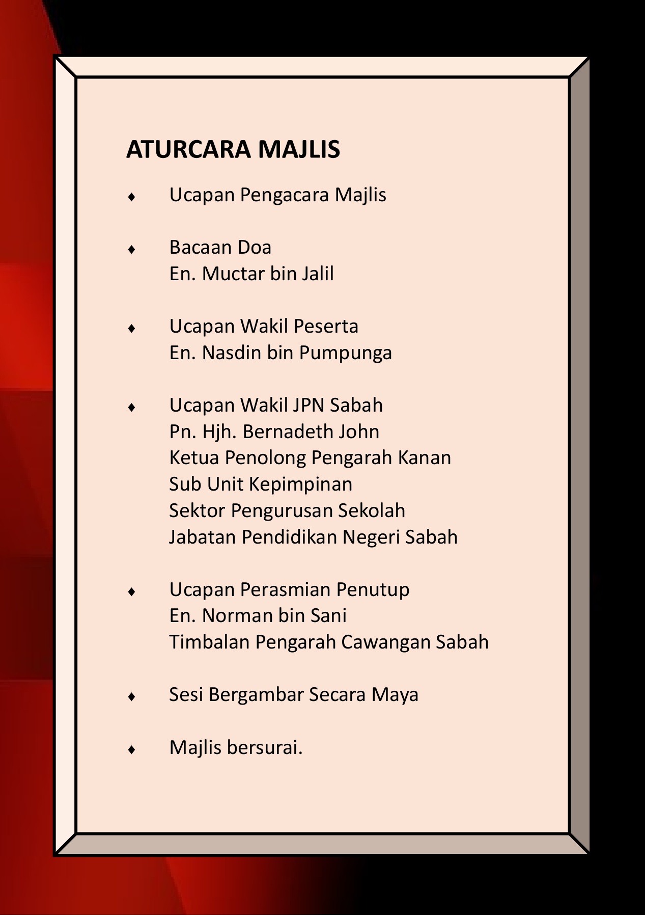 . SENARAI NAMA GURU PENGIRING. Pihak majlis memohon kerjasama hadirin sekalian untuk berdiri dan menyanyikan Lagu Negaraku dengan penuh bersemangat pada pukul 9 pagi. Ketibaan Pengarah Bahagian Sukan Kementerian Pendidikan Malaysia.